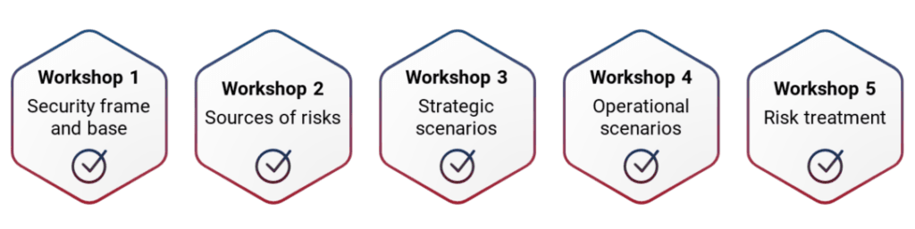 EBIOS approach consists of an iterative cycle of five phases, also known as workshops: security frame and base, sources of risks, strategic scenarios, operational scenarios, and risk treatment.